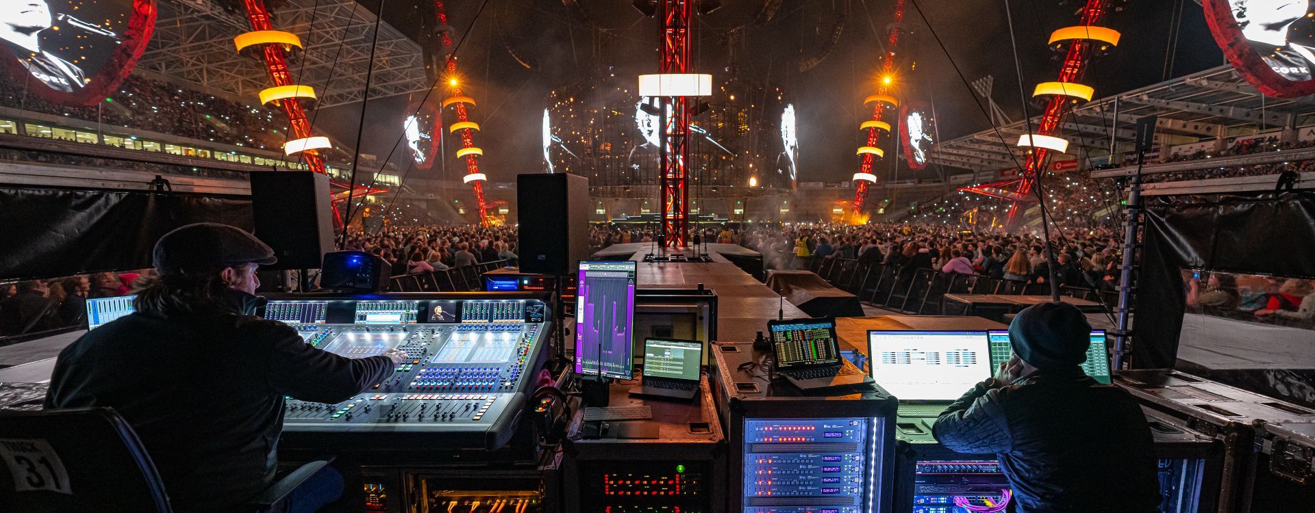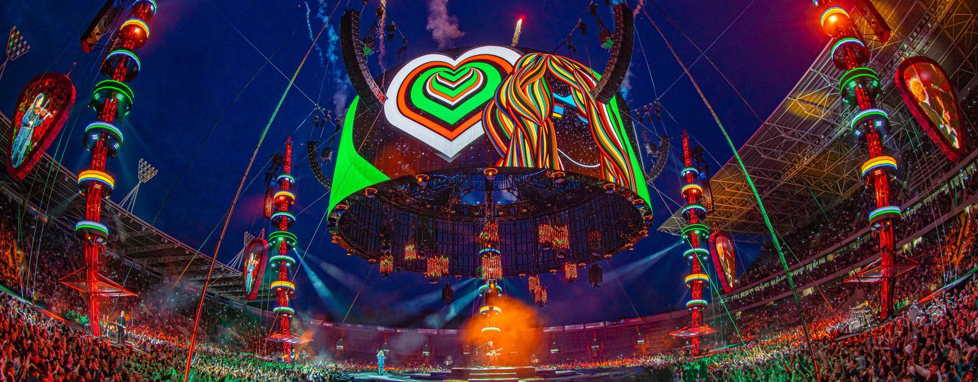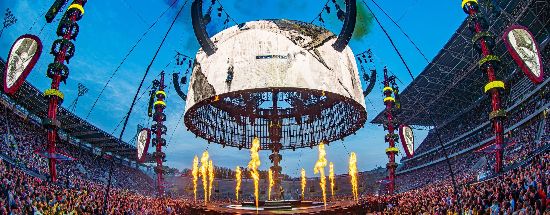 The stage is configured in the round with a rotating outer ring for maximum engagement. It features over 900 square feet of Black Marble (BM5) panels and is the centerpiece for an open-style halo, serving as the main display. This design utilizes just under 5,000 sq ft of Vanish (V8T) panels and incorporates the transparent nature of the ROE product. Surrounding the stage are six giant posts with six mini halos comprised of Carbon (CB5) tiles. From the towering posts hang six double-sided Carbon (CB5) plectrum displays resembling guitar picks.